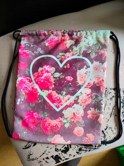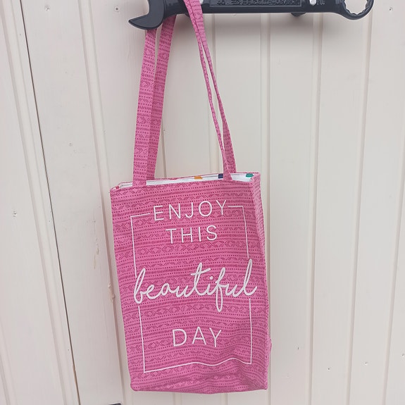 Kangaskassi, pinkki, teksti toisella puolella