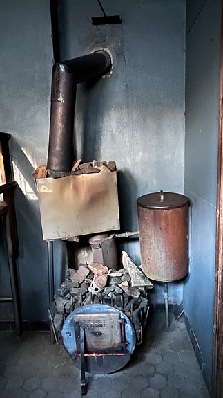 Kiuaskokonaisuus - puukiuas ja kuparinen vesisäiliö (purettuna)