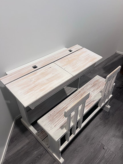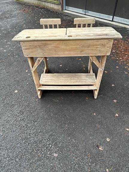 Vanha valkoinen puinen koulupöytä ja penkki