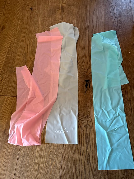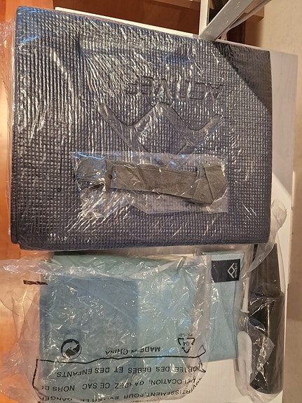 Joogamatto, jumppapallo, pumppu, vastuskuminauha ja vyö.