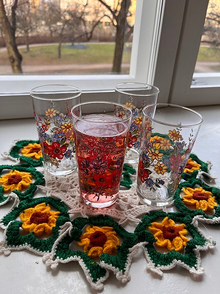 4 retro-kukkalasia ja virkattu liina