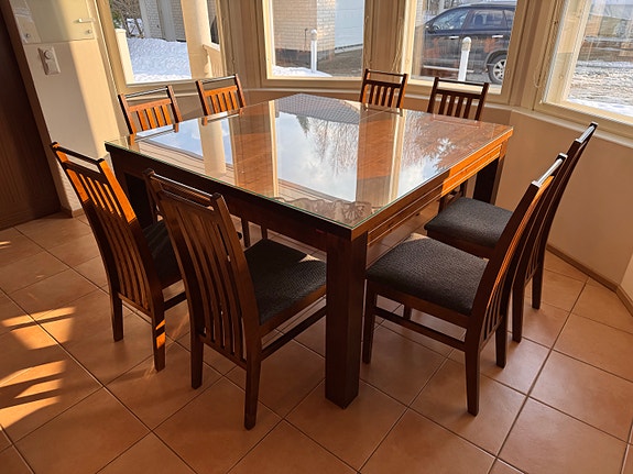 Pohjanmaan kalusteen ruokapöytä ja kahdeksan tuolia