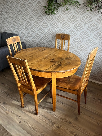 Pyöreä pöytä halk. 110cm ja 4 tuolia