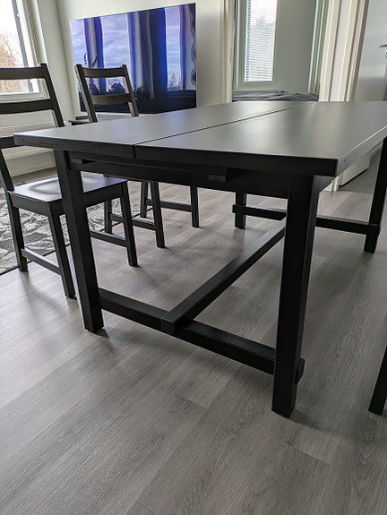 IKEA NORDVIKEN jatkettava musta ruokapöytä ja 4 tuolia