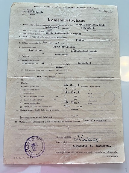 Komennustodistus vuodelta 1944