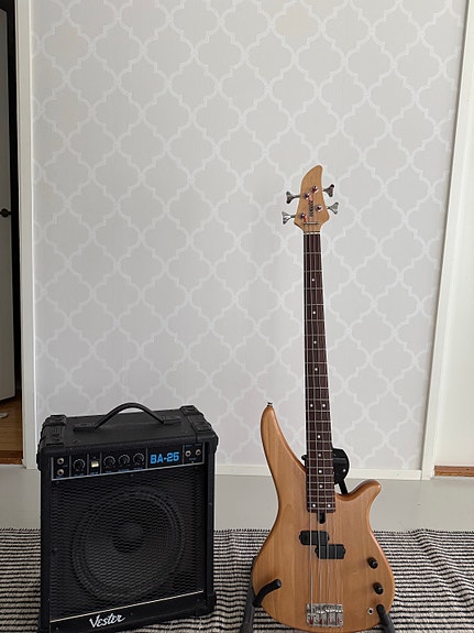 Yamaha bassokitara + BA-25 vahvistin + tarvikkeet