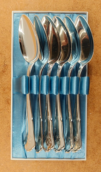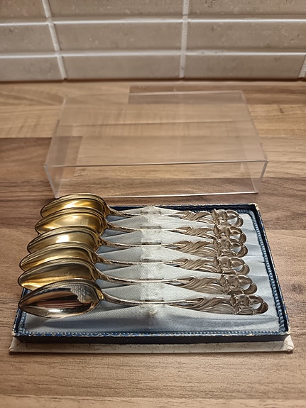 Vanha alpakka kahvilusikkasarja 6 kpl, kullatut pesät, rasiassa