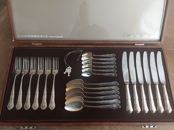 Chippendale 24-osainen hopeinen aterimet kokonaisuus 830 B8. Kaiverruksin