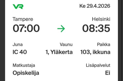 8 €VR junalippu Tampere–Helsinki ke 29.4., opiskelijaTampere, Hervanta, Pirkanmaa3 pvLisää suosikiksi.Avaa ilmoitus