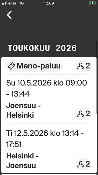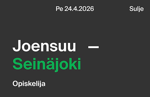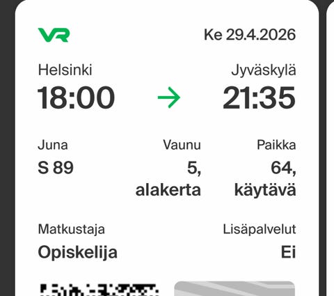 12 €Junalippu Jyväskylä–Helsinki ti 28.4.2026Jyväskylä, Mäki-Matti, Keski-Suomi1 pvLisää suosikiksi.Avaa ilmoitus