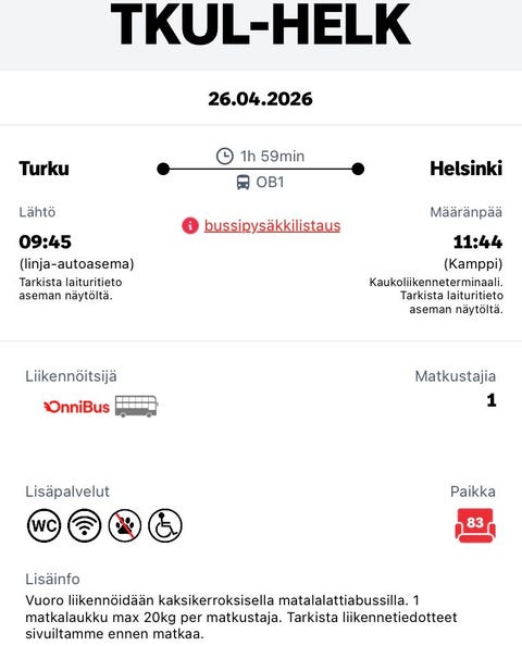 5 €OnniBus-lippu Helsinki–Turku 26.4.2026Turku, Turku Keskus, Varsinais-Suomi11 tLisää suosikiksi.Avaa ilmoitus