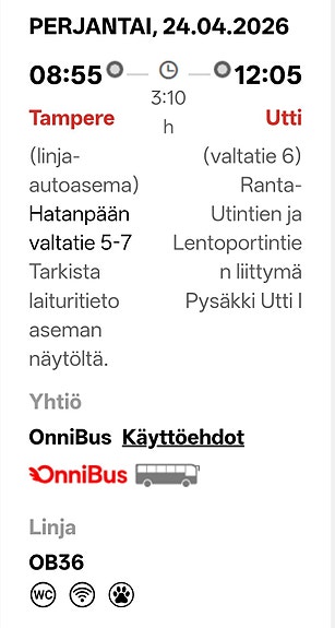 8 €OnniBus lippu Turku–Tampere 25.4.2026Turku, Iso-Heikkilä, Varsinais-Suomi3 pvLisää suosikiksi.Avaa ilmoitus