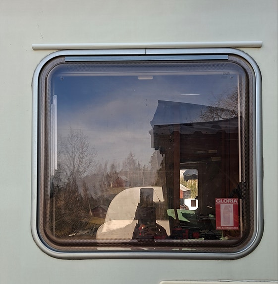 Matkailuauton ikkuna hyttysverkolla ja pimennysrullalla